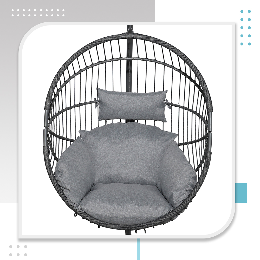 - MODERN DESIGN: Curved seating, rich grey rattan weave in a complex pattern and polished grey stand emphasize the egg swing chair‘s modern style, allowing the hanging hammock chair to blend seamlessly with your decor. Tufted cushion tucks right in for a comfy spot to nest.