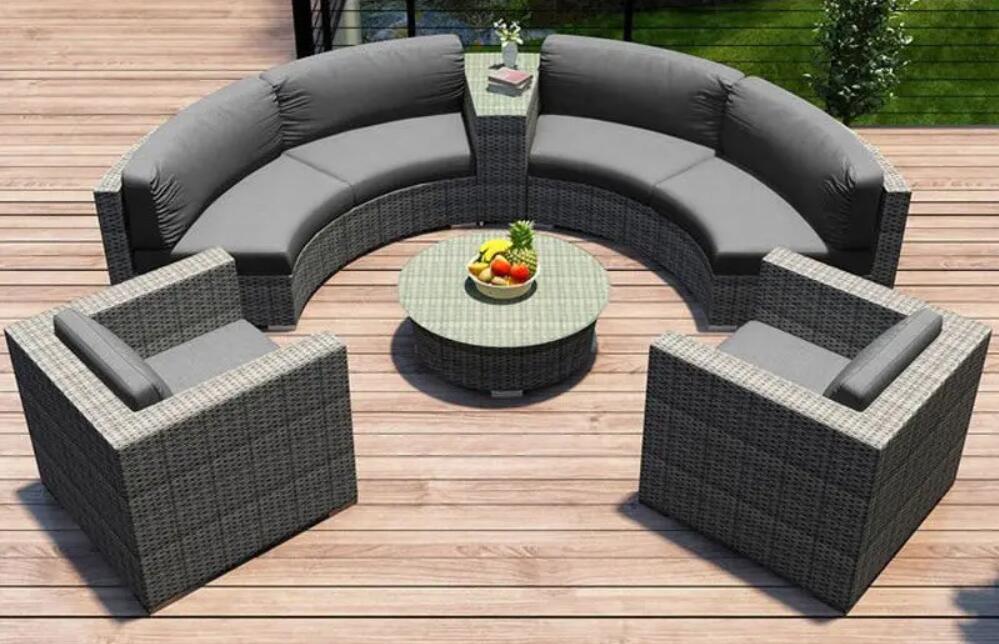 Curved: A curved outdoor sectional has a more elegant, sophisticated look. It's great for creating a more formal atmosphere in your outdoor space. A curved outdoor sectional is called that because the individual pieces of the set are arranged in a curved shape, rather than a straight line. This allows the sectional to create a more inviting and cohesive seating area in an outdoor space. In addition to being called a curved outdoor sectional, this type of furniture can also be referred to as a curved outdoor sofa, half moon sectional sofa or a curved outdoor couch.