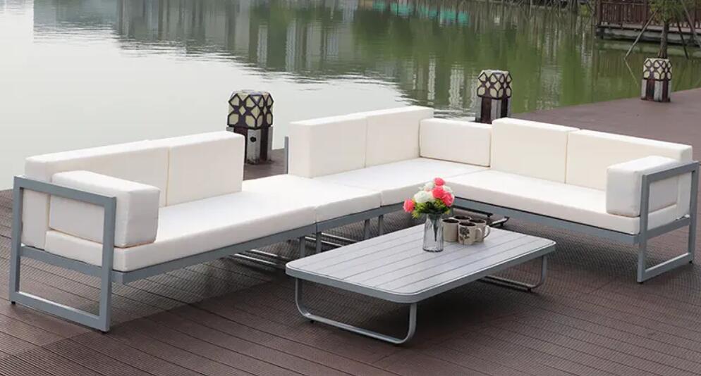 Metal: Metal outdoor sectionals are made from materials like aluminum or steel, such as aluminum or iron. They are strong and durable, and can be coated with a weather-resistant finish to prevent rusting. The aluminum outdoor sectional sofa set is a type of furniture designed for use outside, typically in a backyard or patio. The outdoor sectional sets are made of aluminum, which is a lightweight and durable material that is resistant to rust and corrosion. Aluminum outdoor sectional sofa sets typically consist of multiple pieces that can be arranged in a variety of configurations to create a comfortable seating area. They are a popular choice for outdoor spaces because they are easy to move and maintain, and they can provide a stylish and comfortable seating area for outdoor gatherings.