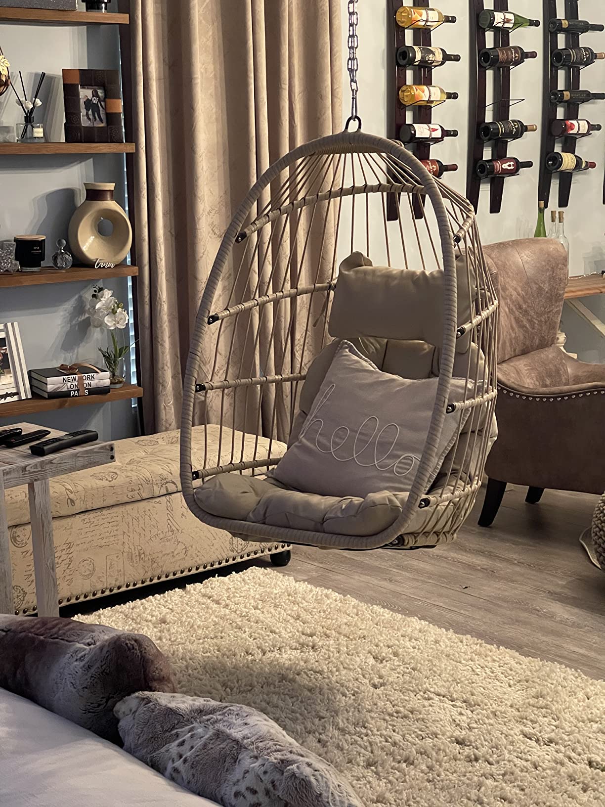 - Hanging egg chair with hardware (usually includes a chain or rope)