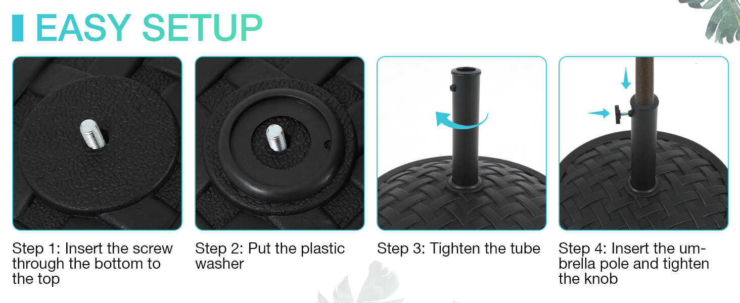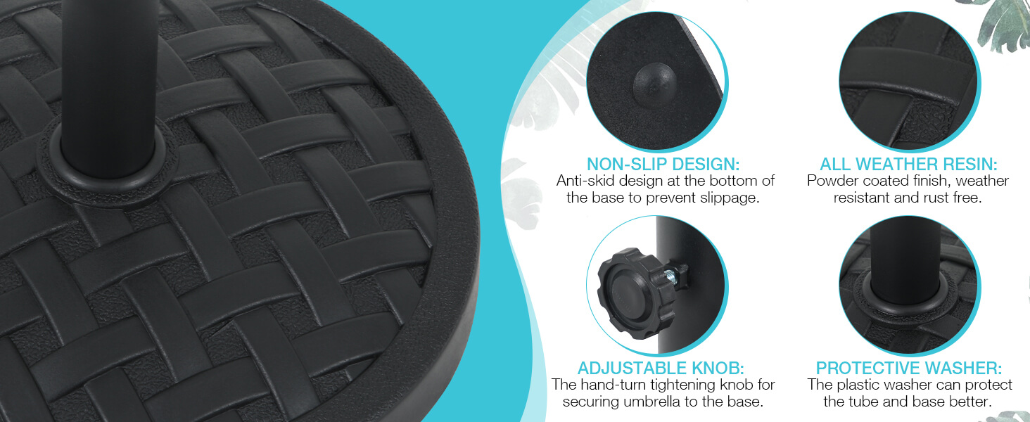 - 【Durable Material】The umbrella base is made of resin, waterproof, UV, and aging resistant. Rust-free material can avoid breakage and paint detachment