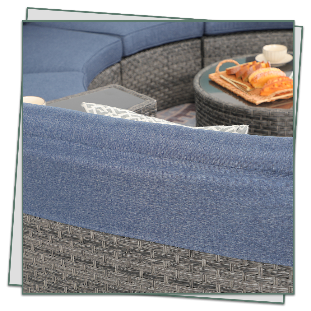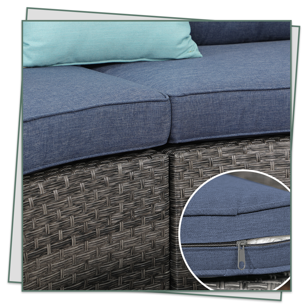 The Halo collection comes with Half Moon Design, premium olefin fabric, and handcrafted all-weather wicker. The elegant synthetic wicker is handwoven into complex patterns that give the patio furniture set its refined look. The striped pillows add a touch of elegance and style to your patio, garden, backyard, porch sunroom or pool.