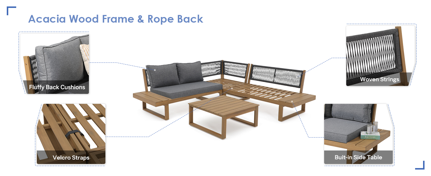 - COMFORT UPGRADE -With clean, precise lines, our modular sectional sofa is the ideal modern accessory for your outdoor space. Wooden frame with woven string backrest, this wood outdoor furniture not only offers a chic appearance but also provides stable structure.