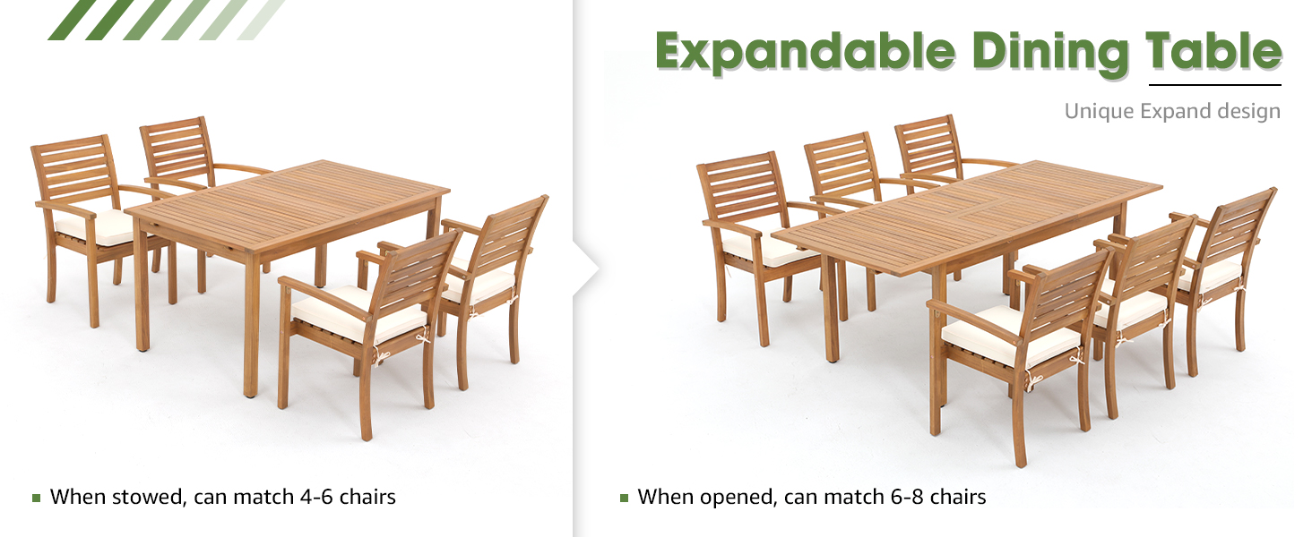 - FSC-Certified Wood: Our 7-piece outdoor dining set is constructed of sustainable FSC-certified acacia wood to ensure the chair can hold up to 300 lbs! The surface is coated with high-grade oil paint making the patio table and chairs weather-proof and built to last.