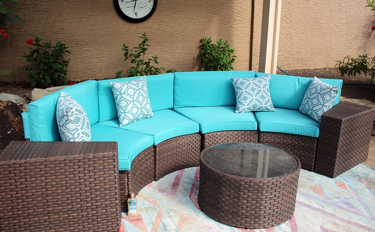 - 【Premium Olefin Fabric】 - Cushions are covered in olefin fabric and constructed with a soft polyester layer wrapped around a thick foam core. The olefin fabric is a soft woven fabric which is durable, fade-resistant, and easy to clean for half moon patio furniture set.