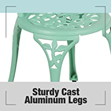 - PREMIUM CAST ALUMINUM-Made of strong cast aluminum with rust- & weather-resistant finish, the 3-piece patio bistro set is durable but lightweight. The sturdy frame helps ensure that the outdoor bistro table and chair set lasts for several years.
