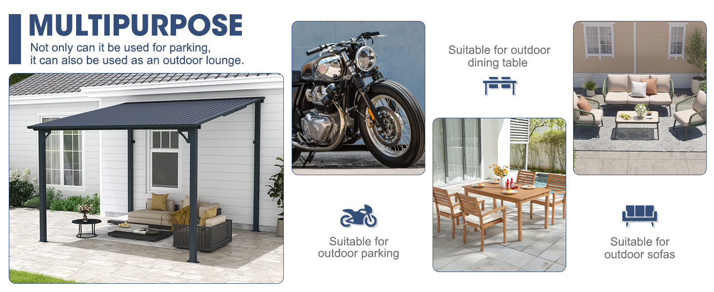This wall-mounted outdoor gazebo adds a stylish extension to your home, seamlessly fitting into your backyard or patio. Made with galvanized iron panels, it reduces heat, blocks 90% of harmful UV rays, and withstands high temperatures and strong winds—perfect for withstanding the diverse weather conditions across the U.S. - SUPERIOR LOAD-BEARING CAPACITY