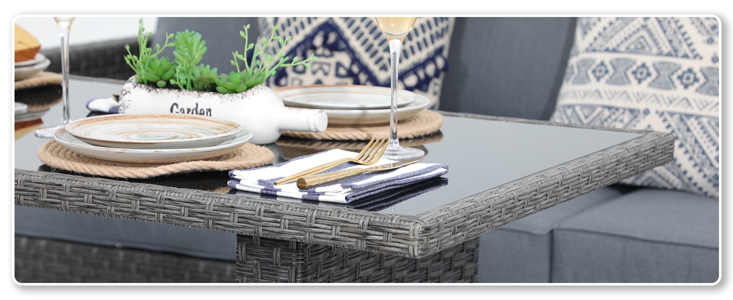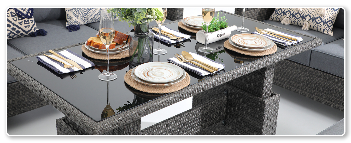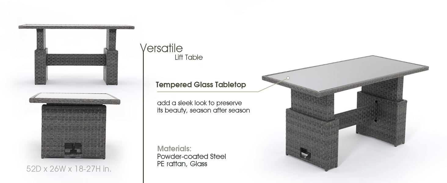 - MORDEN APPEARANCE: Grey resin wicker in a complex pattern paired with a glass table top, a textured look, this liftable dining table is the perfect beautiful focal point in patio furniture to hold your breakfasts, dinners, or a simple coffee date.