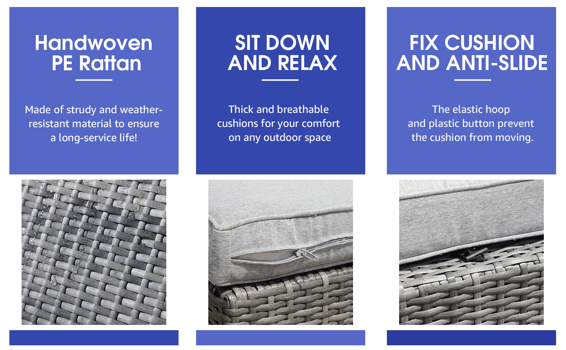 - Upgraded Comfort With 220g polyester covers, over 3-inch cushions are for perfect comfy outdoor patio seating and relaxation; The elastic hoop and plastic button prevents the cushion from moving. Anti-skidding foot mat with adjustable levelers makes it easy to adjust the height to maintain balance.